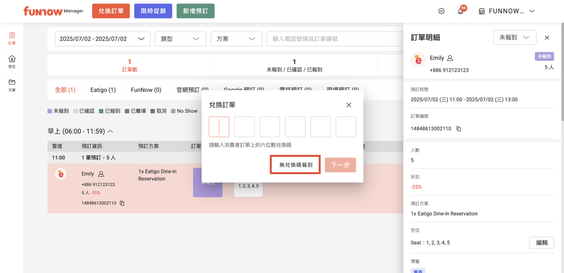 3. 點擊「無兌換碼報到」,再點擊「兌換訂單」以完成確認操作