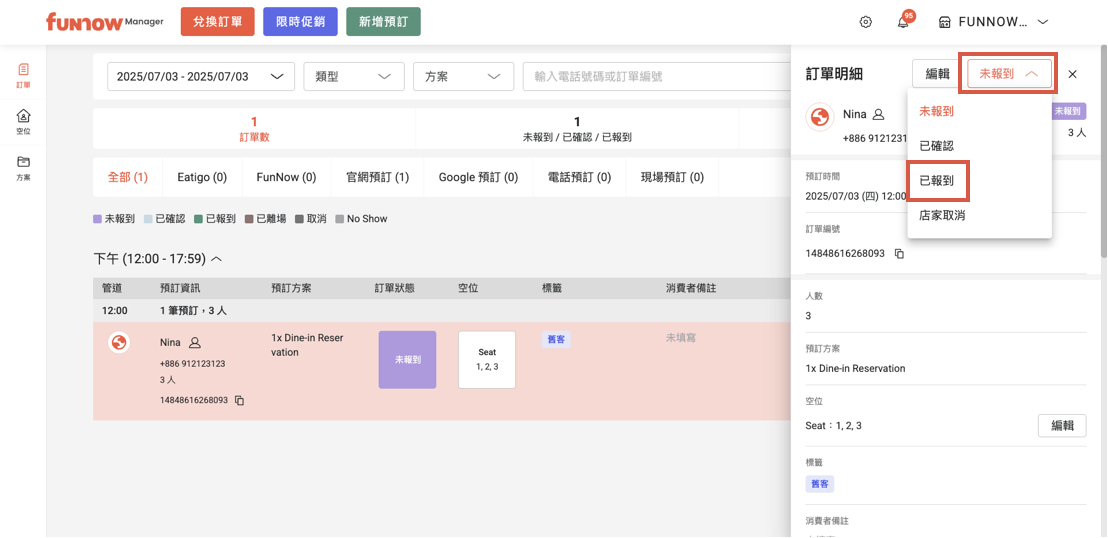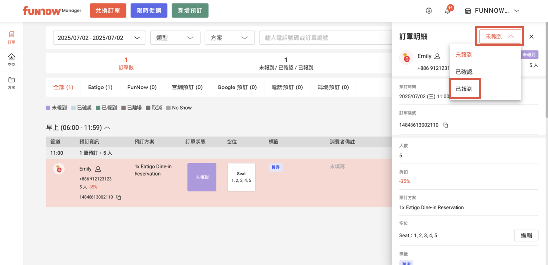 2. 點擊訂單明細右上角的「訂單狀態」,選擇「已報到」即完成訂單報到