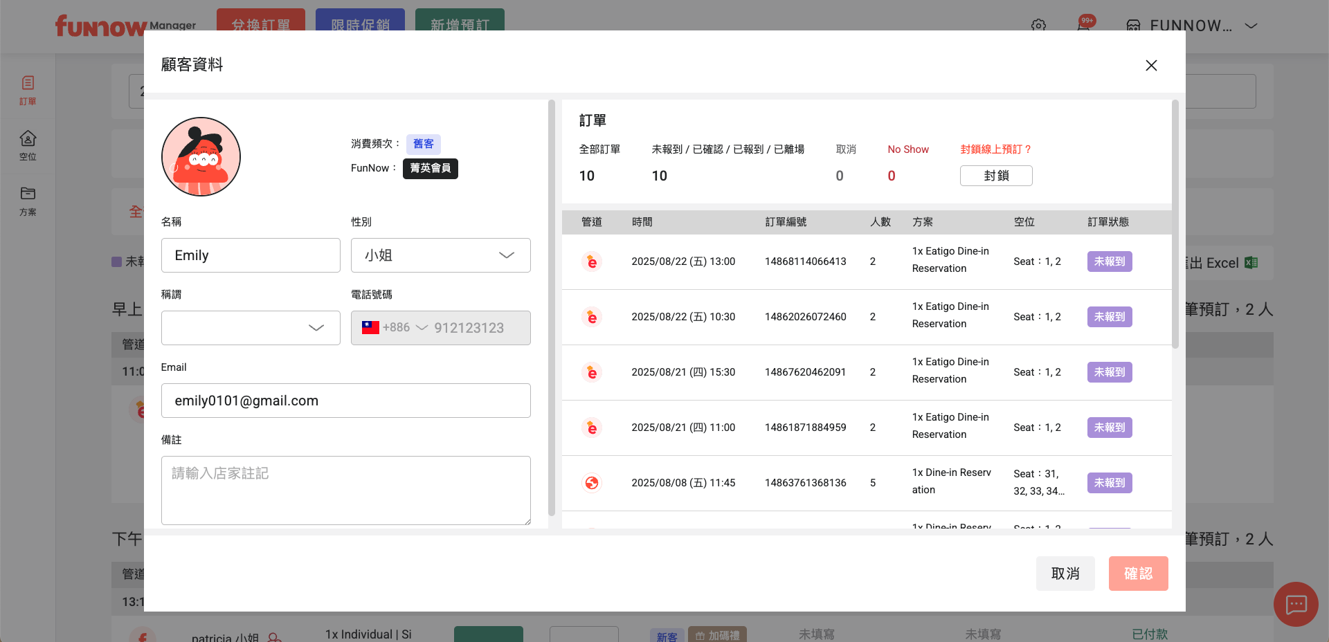 如何查看顧客資料? 2025年08月26日 02:34 更新於 1. 進入「訂單」頁面2. 點擊預訂姓名旁的人物圖示,即可開啟顧客資料頁面 相關文章 在顧客資料中可以查看哪些資訊? 如何將消費者封鎖 / 加入黑名單? 如何編輯顧客資料? 如何調整 YC 設定? 為什麼需要設定限時促銷?