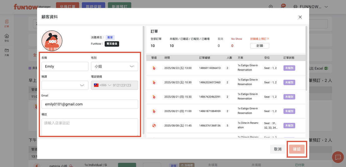 如何編輯顧客資料? 2026年02月03日 03:38 更新於 1. 進入「顧客資料」頁面在此頁,您可以編輯消費者的姓名、性別、稱謂及 Email 等基本資訊您也可以利用「備註」欄輸入與該消費者相關的特殊需求或重要事項,方便後續管理與服務。電話欄位為消費者預訂時所填寫,系統會自動紀錄並用於跨平台比對。為確保資料一至性,此欄位不提供手動編輯。若消費者當初未填寫,則顯示為空白。2. 更改完成後,點擊「確認」以儲存變更 相關文章 在顧客資料中可以查看哪些資訊? 如何查看顧客資料? 如何在 inline 後台編輯預訂時間? FunNow Manager Web 新版本上線 如何將消費者封鎖 / 加入黑名單?