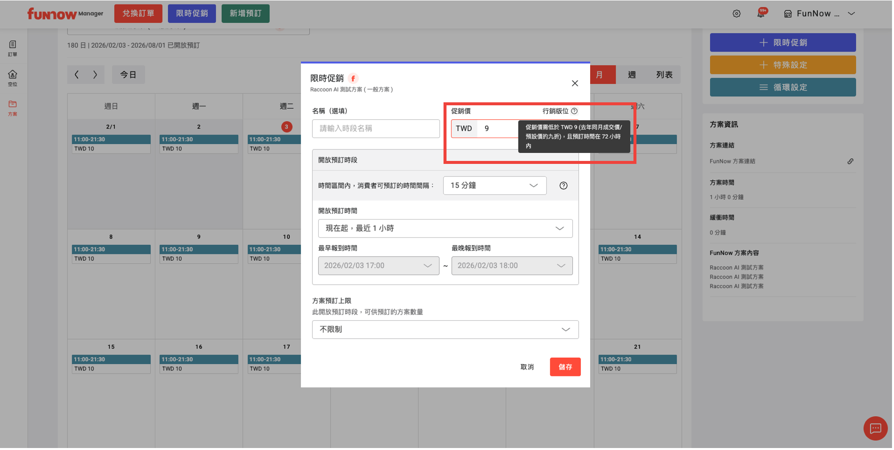 3. 設定欄位,填入促銷價格,並選擇開放預訂時段