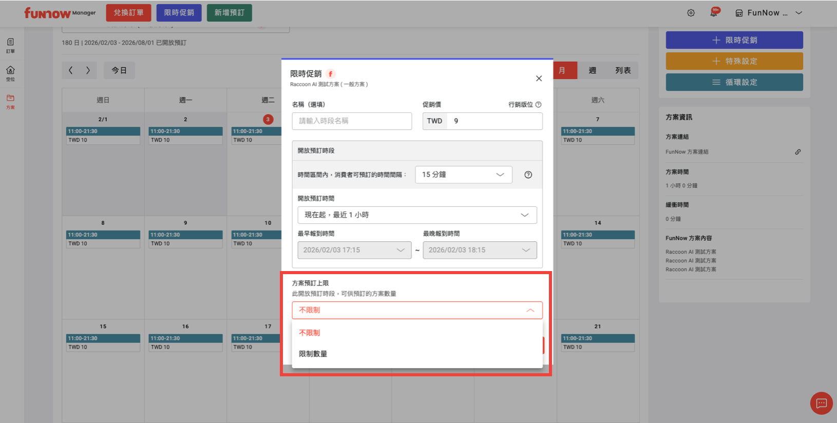 若選擇「限制數量」,一旦促銷方案售完,系統將自動轉回原循環價格持續販售。若無需限制,系統將預設為「不限制」