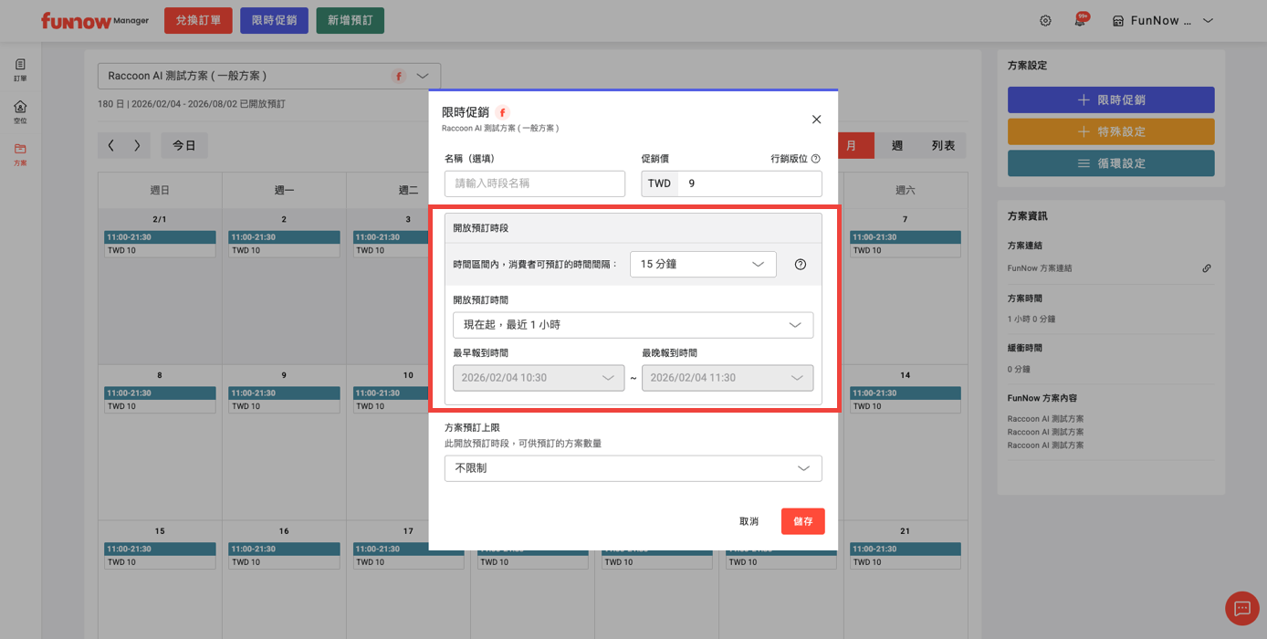 即使將某個時段設為「特殊設定」,在該時段產生的訂單仍會納入限時促銷價格的計算中,因此不建議您透過特殊設定來降低方案售價。