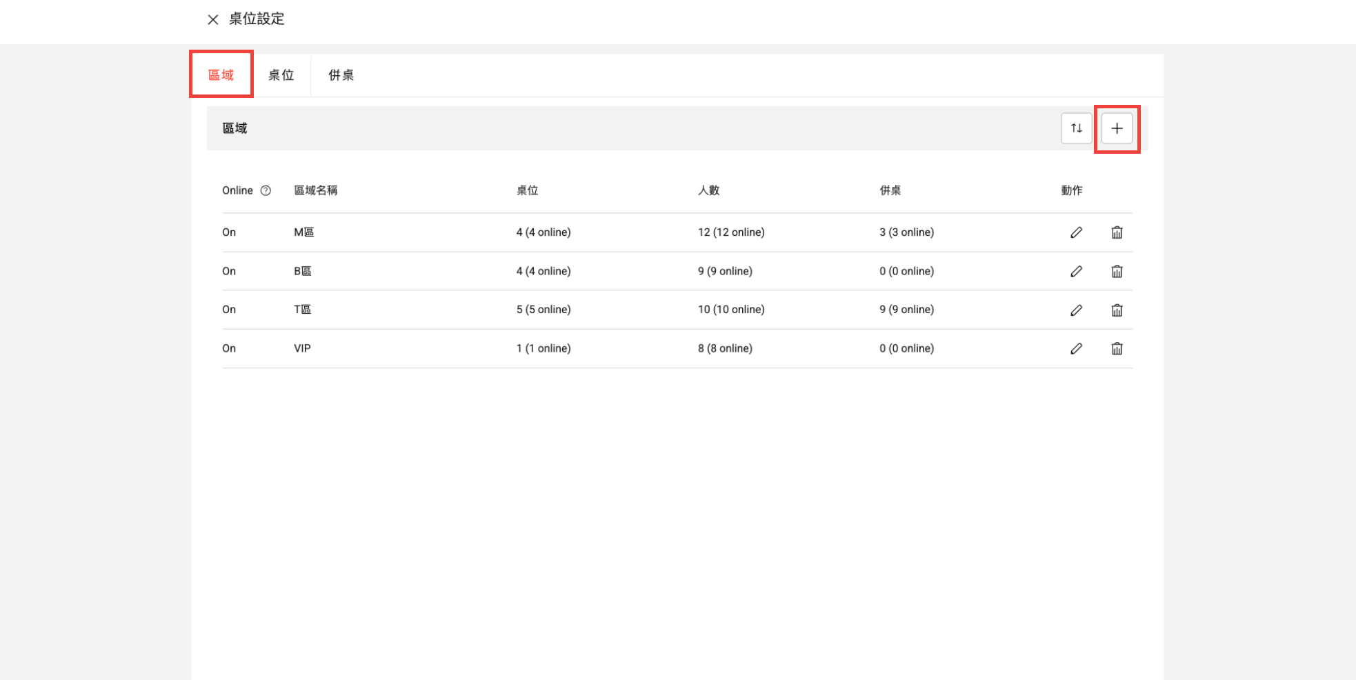 4. 新增完區域後,進入「桌位」區塊,選擇您想要新增桌位的區域,並點選「+」號