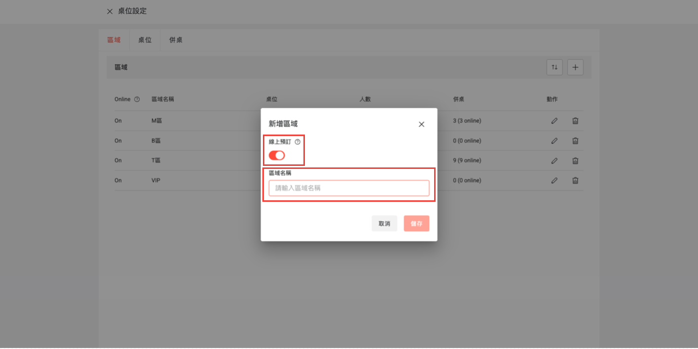 3. 新增區域:勾選「線上預訂」,為您新增的區域命名,以方便後續管理