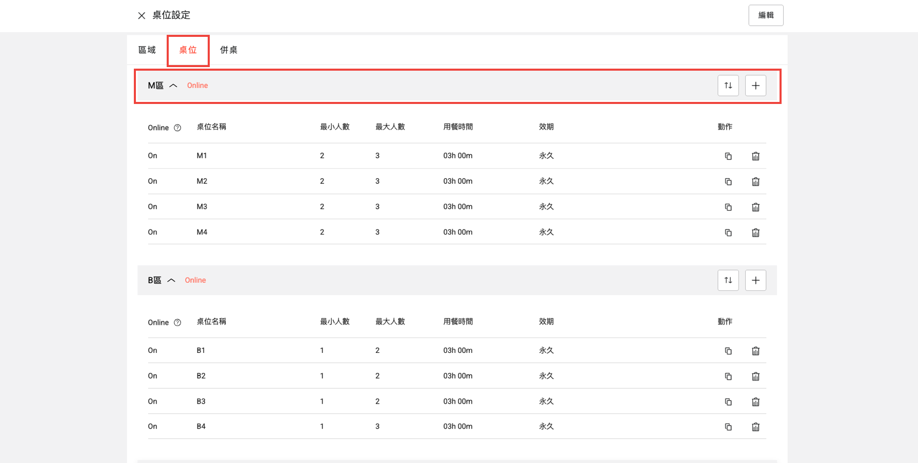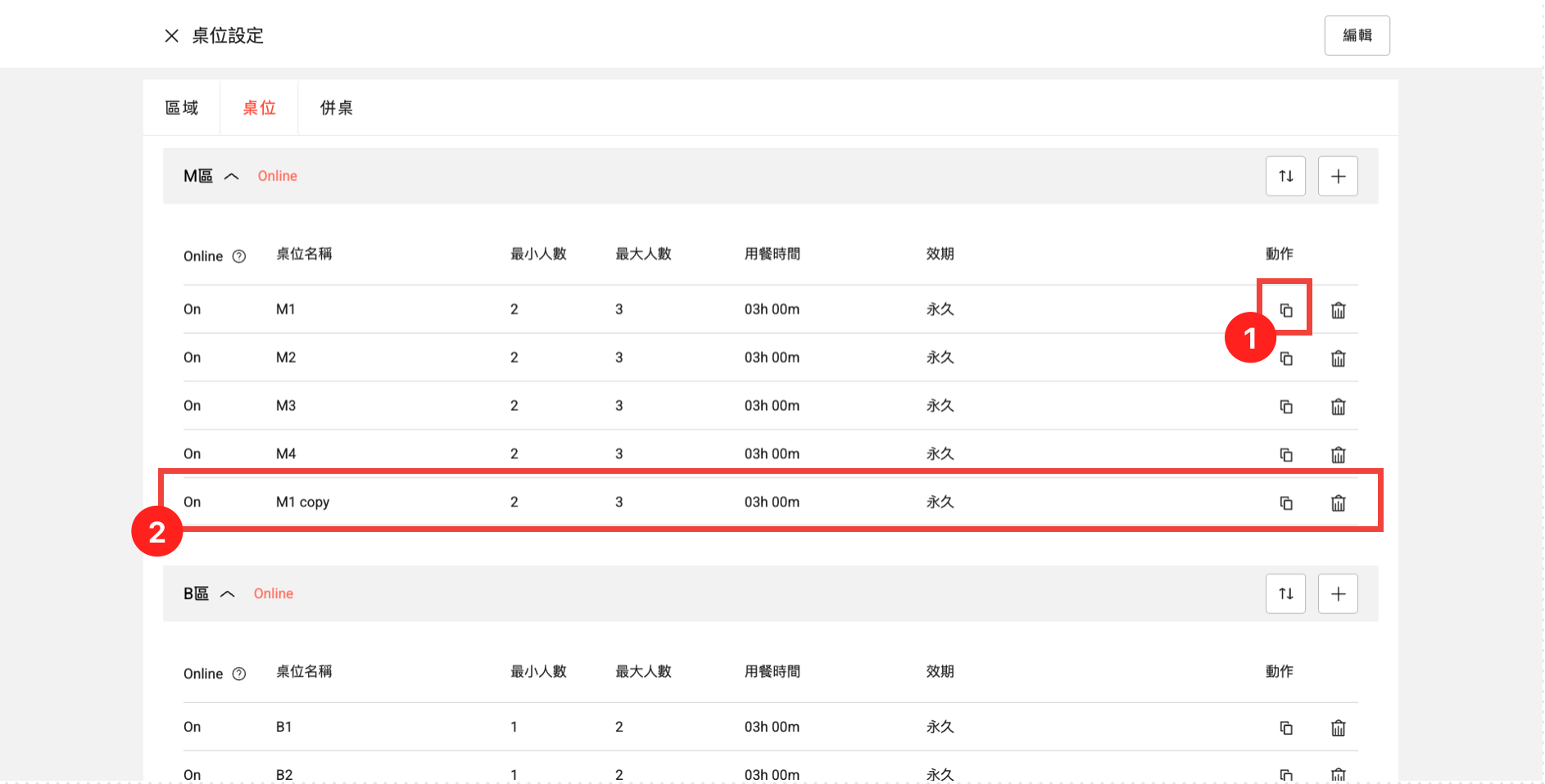 補充:如果您想要新增設定相同的桌位,可以點擊「複製」圖示,以快速建立桌位,無需重複填寫設定。