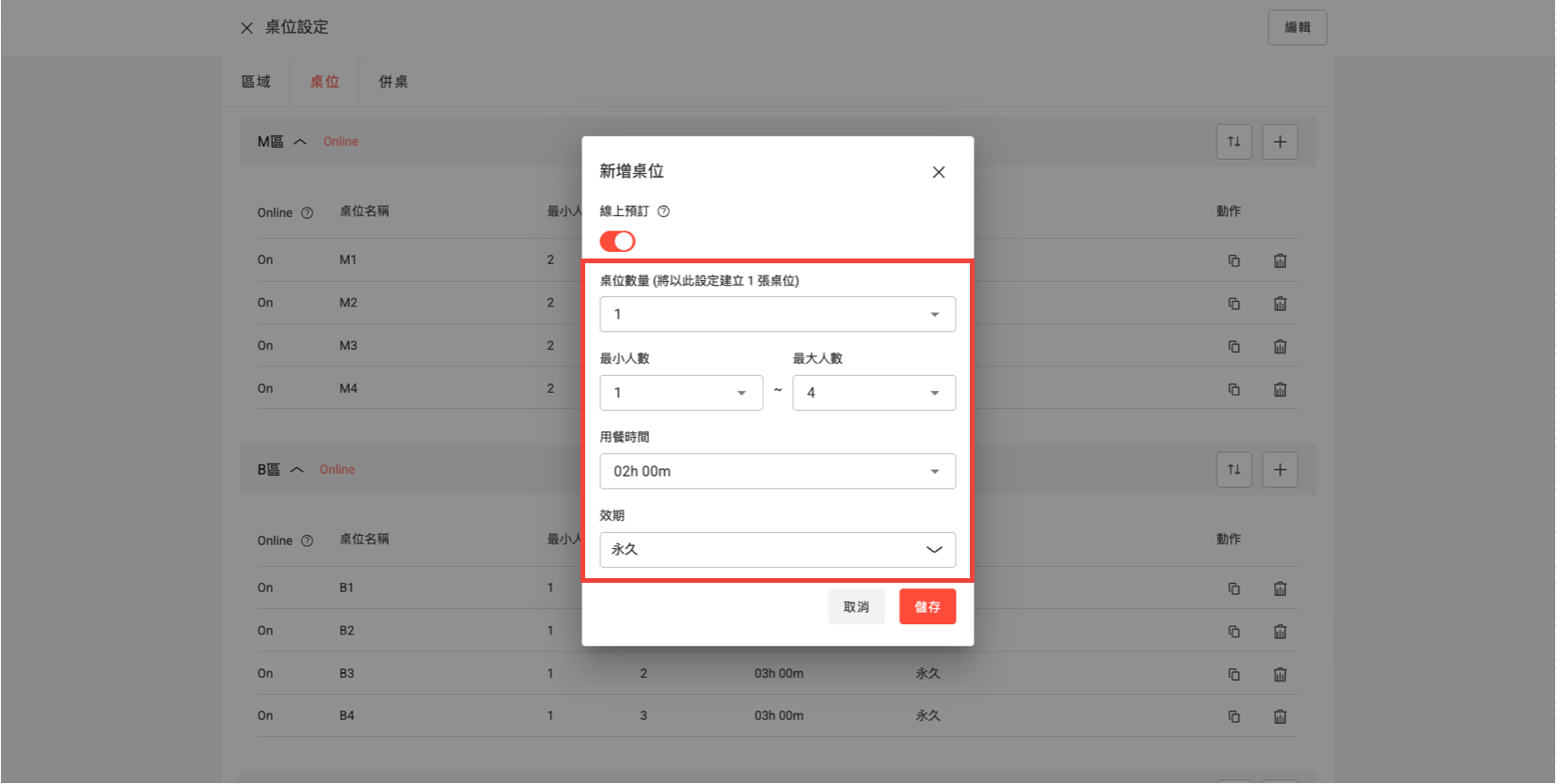 - 最小人數、最大人數:此設定將定義該桌位可接受預訂人數區間。例如:若設定為 1 - 4 人,系統會自動將符合此人數範圍(無論 1 人或 4 人)的訂單,分配至該桌位。