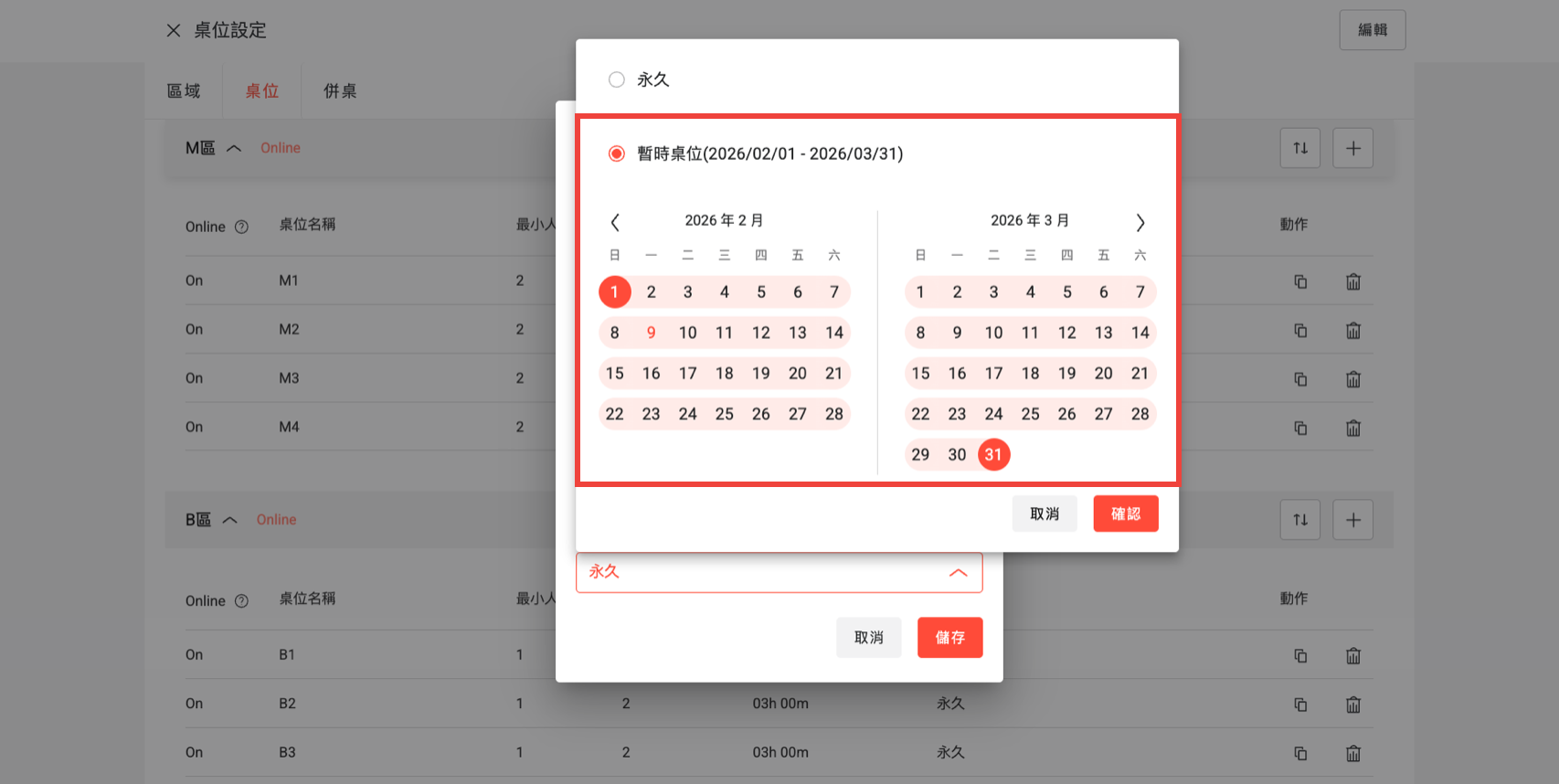 - 永久:該桌位將作為常態性座位,無限期開放消費者預訂。