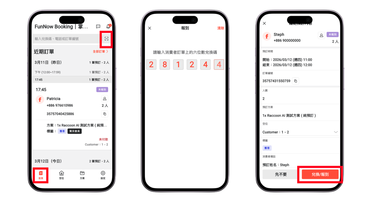 如何使用兌換碼核銷/兌換訂單? 2026年04月02日 06:40 更新於 當消費者預訂 FunNow 商品後,會得到一組六位數兌換碼,輸入兌換碼以核銷訂單 1. 前往「首頁」頁面,並點選右上方「」 圖示。2. 輸入消費者訂單上的六位數兌換碼。3. 確認訂單資訊無誤後,即可點選「兌換/報到」以核銷訂單。 相關文章 如何不使用兌換碼報到? 如何重新指派訂單空位? 如何利用篩選器查看特定日期的訂單? 如何將消費者封鎖 / 加入黑名單?