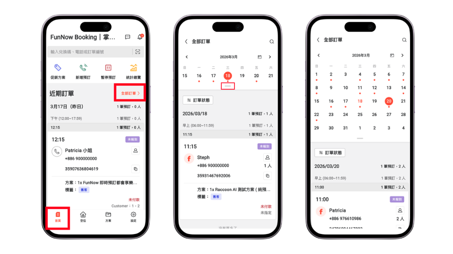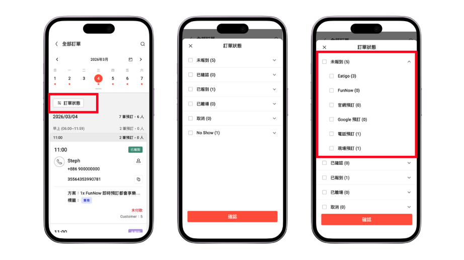 2. 若您與 FUNNOW GROUP 跨平台合作,或合作 FunNow Booking (SaaS) 服務,則可以在不同訂單狀態中,再篩選來自不同管道 ( FunNow / Eatigo / 官網 / 現場 / 電話 ) 的訂單