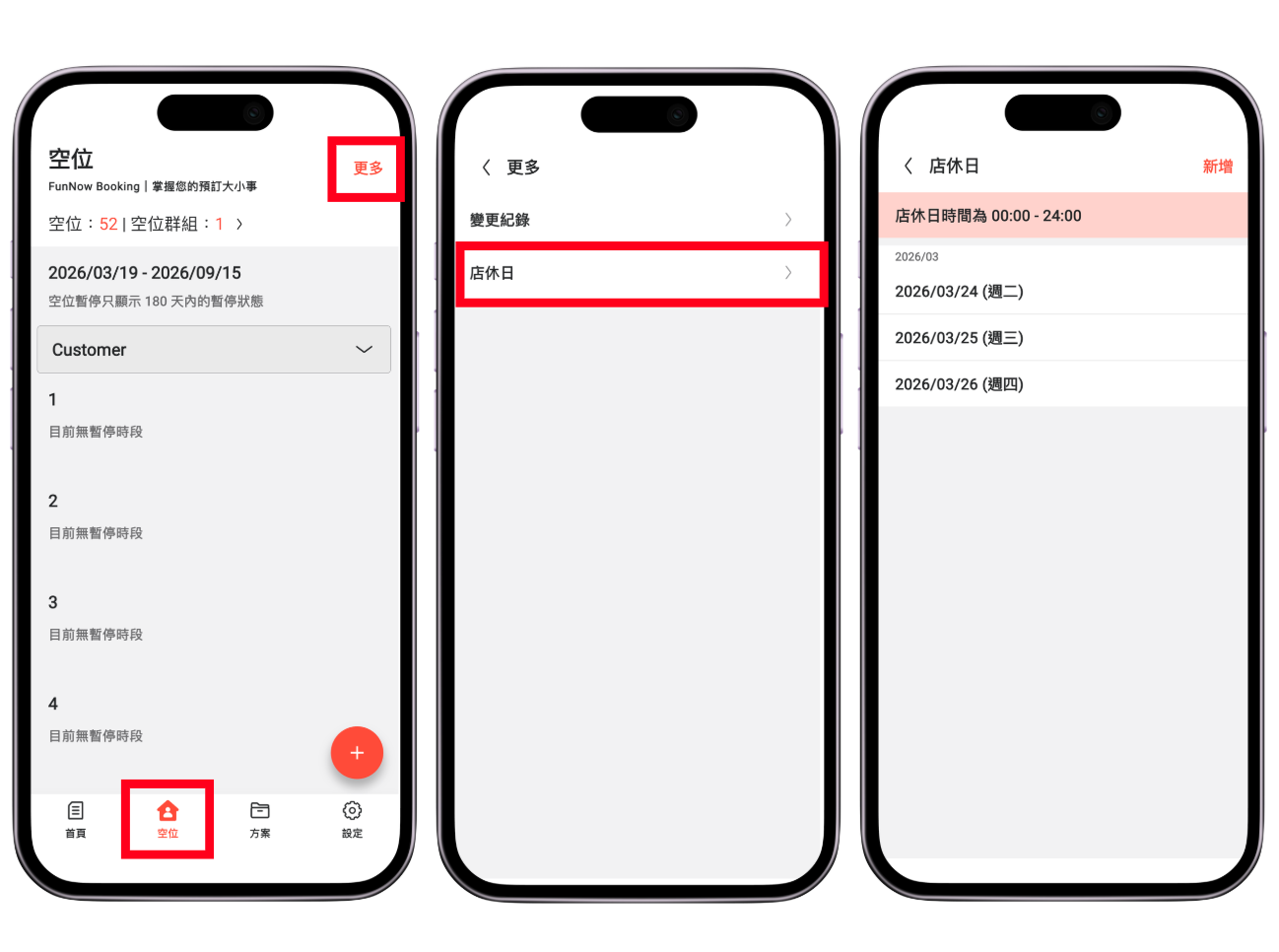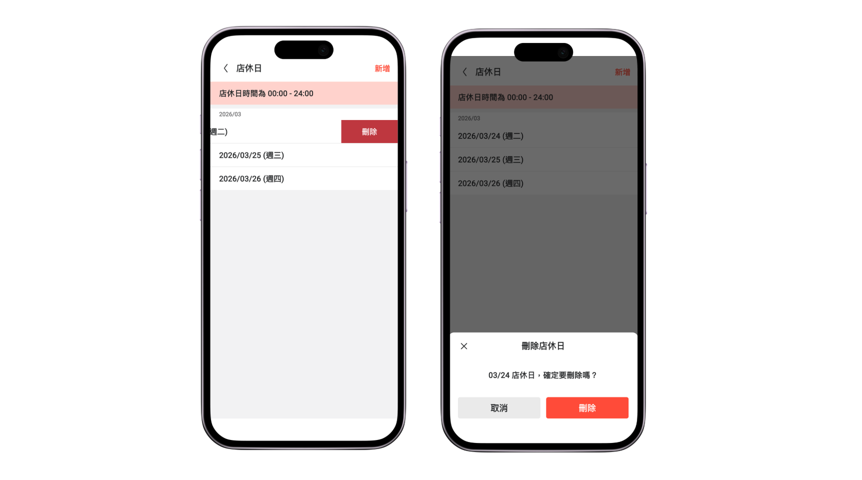 如何刪除已設定的店休日? 2026年04月01日 04:19 更新於 1. 進入到「空位」頁面,並點選「更多」。2. 點選「店休日」3. 將您想要除的店休日向左滑,並選擇「刪除」。4. 再次點選「刪除」以成功刪除。確認刪除後,該日期將重新開放線上預訂。 相關文章 如何設定臨時店休日? 如何刪除已新增的空位? 如何將已暫停空位恢復上架? 如何查看已設定的空位暫停?
