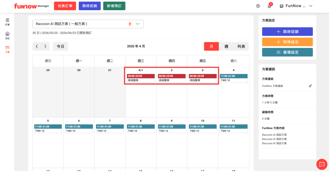 如何重新開放已暫停方案給消費者訂購? 2026年03月30日 03:43 更新於 若您希望重新開放已暫停的方案(例如:原暫停 4/1 - 4/3,但您希望提前恢復供應),可透過以下兩種方式操作:方法ㄧ:透過「月」檢視畫面操作1. 點擊已暫停方案2. 點選彈出視窗中的「恢復上架」,並點擊「確認」3. 恢復上架後,該時段將轉回可預訂狀態 方法二:透過「列表」檢視畫面操作1. 在方案頁面,進入到「列表」檢視畫面 2. 在時段暫停區塊中,選擇您想要重新開放的訂單,點選右側「恢復上架」按鈕,並點選「確認」。3. 恢復上架後,該時段將重新開放預訂