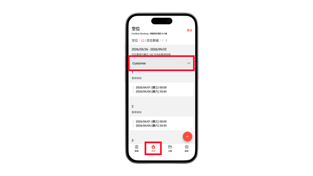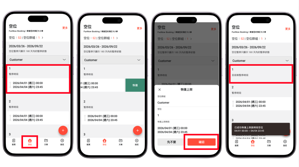 如何將已暫停空位恢復上架? 2026年04月01日 04:18 更新於 與第三方平台如 inline / Ebisol 等串接之店家不適用此設定。 進入到「空位」頁面將想恢復上架空位的已暫停時段向左滑動,並點擊「恢復」點選「確認」看到「已成功恢復上架該時段空位」的訊息即表示操作成功註記:如果您的店家有設定多個空位群組,你可以點擊頁面中間空位群組列表以切換不同空位群組。 相關文章 如何暫停無法提供預訂的空位? 如何設定臨時店休日? 如何登入 FunNow Manager App? 如何新增空位? 如何新增可提供預訂的空位?