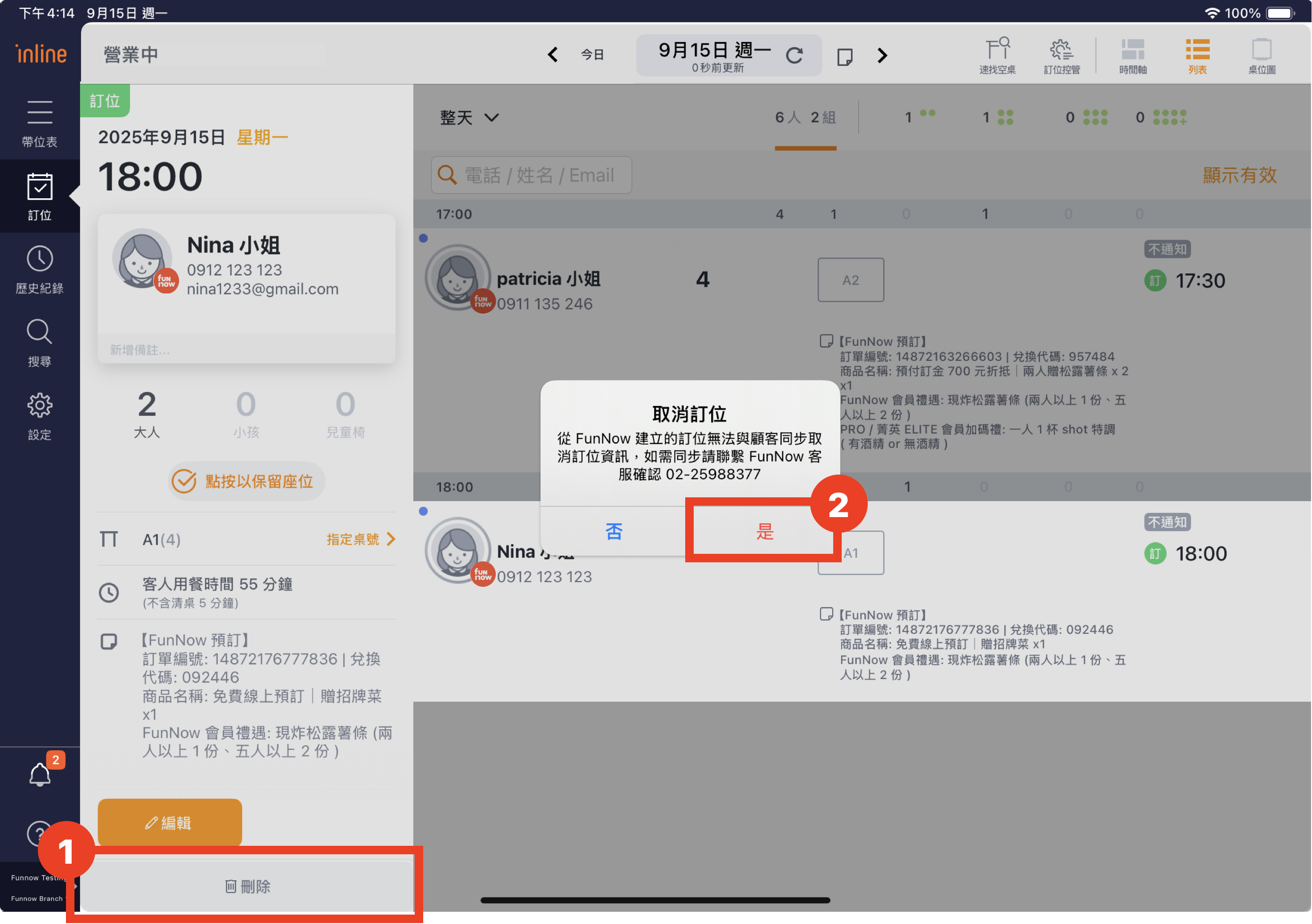 當遇到不可抗力因素需取消消費者預訂,或消費者因故無法如期到店時,您可以使用 「刪除」 功能,將該筆訂單刪除 / 取消。