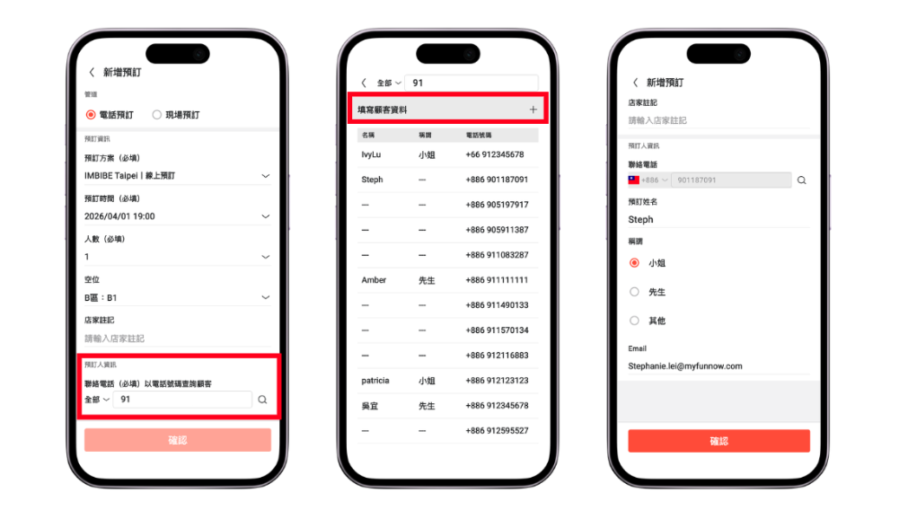 在新增預訂時,您可以透過「電話號碼」快速搜尋顧客,並將顧客資料自動帶入備註欄位,減少手動輸入時間。