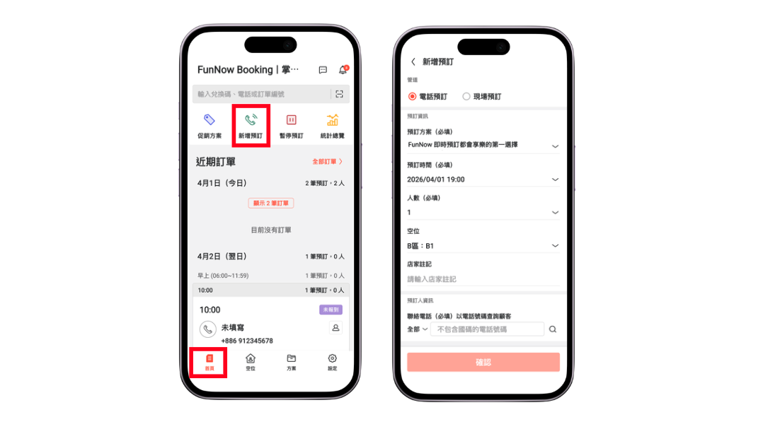 當消費者非透過您的官網預約連結預約時,您可使用「新增預訂」功能,將來自其他管道 ( 例如:電話或現場 Walk-in ) 的訂單手動建立於 FunNow Manager 中,方便您統一管理所有訂單。