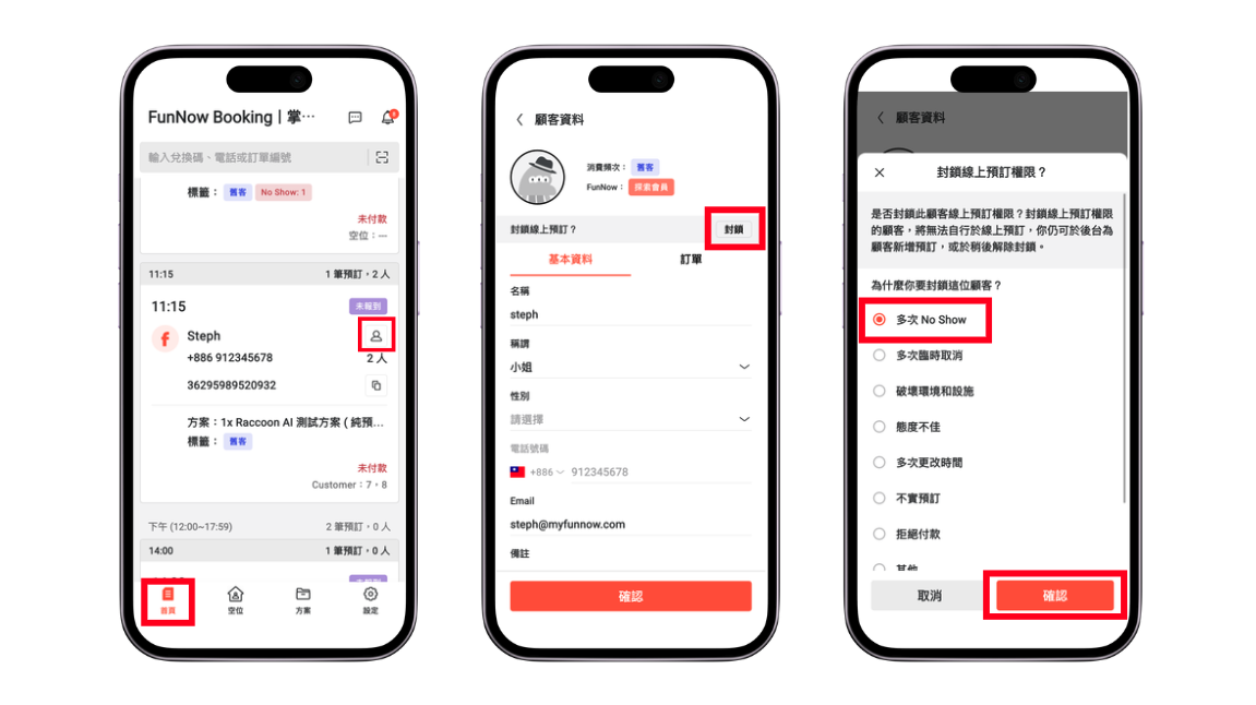如何將消費者封鎖 / 加入黑名單? 2026年04月02日 03:47 更新於 黑名單功能適用於 FunNow、Eatigo、FunNow Manager (SaaS) 以及分銷通路 ( 如 PChome、KKday、DianPing)。若分店同時開放多個管道進行預訂,該消費者在所有管道皆無法完成預訂。 1. 進入「首頁」頁面,點擊該筆訂單旁的人物圖示,進入顧客資料頁面2. 點擊「封鎖」按鈕3. 您可以選擇系統預設的封鎖原因,或於備註欄位中自行輸入封鎖此消費者的原因。完成後請點擊「確認」以儲存封鎖設定 相關文章 如何將消費者封鎖 / 加入黑名單? 如何將消費者解除封鎖?