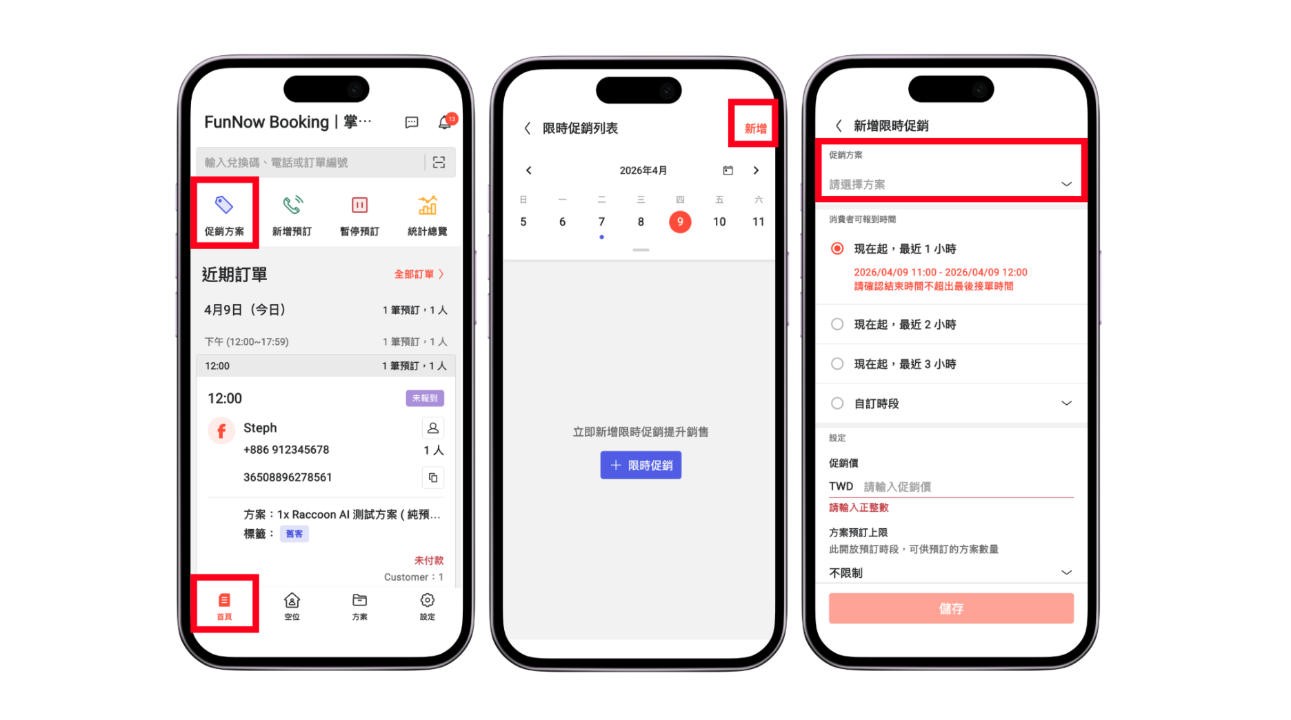 選擇最早報到日期與時間 ( 若想設定 4/9 20:00 到 4/9 22:00 的促銷,則開始日期為 4/9、開始時間為 20:00)