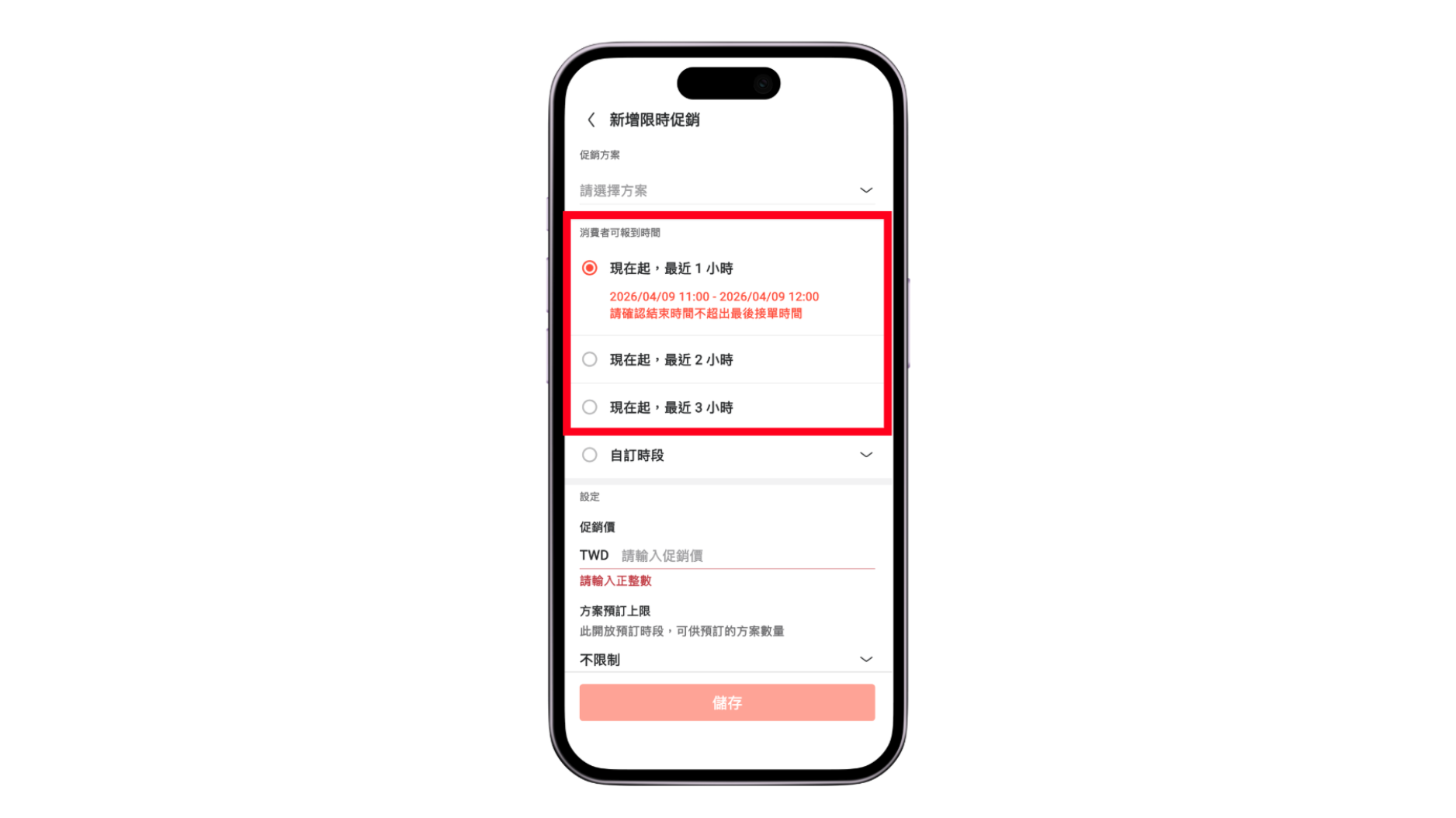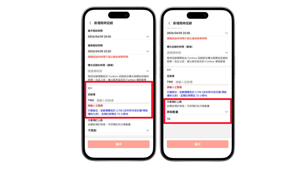 註記:限時促銷不能設定超過 24 hr,且僅能設定 30 天內的限時促銷