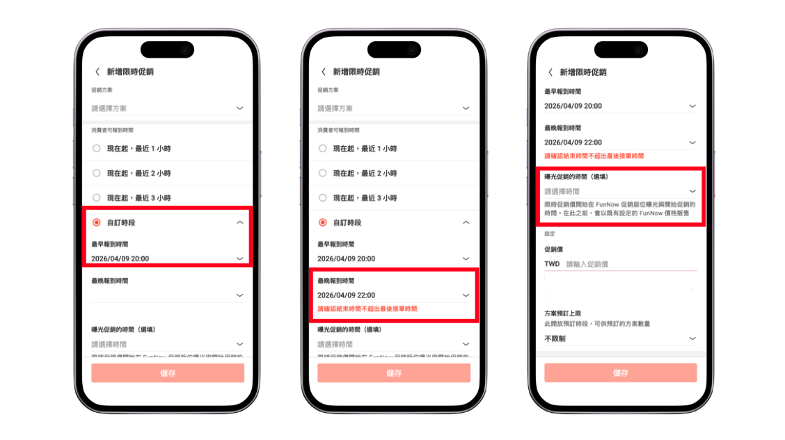 選擇最晚報到日期與時間 ( 若想設定 4/9 20:00 到 4/9 22:00 的促銷,則結束日期為 4/9、結束時間為 22:00)
