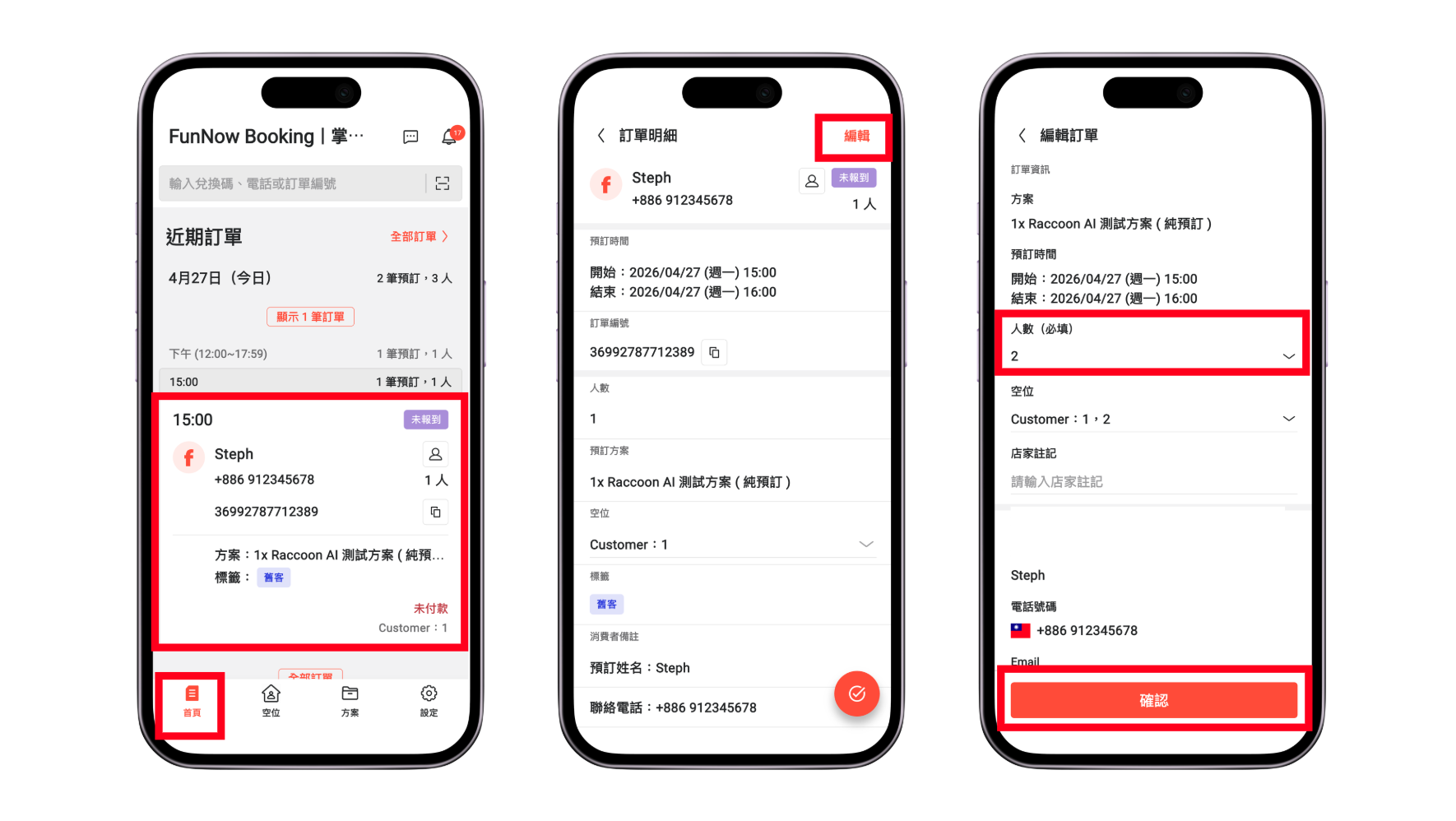 如何編輯訂單人數? 2026年04月27日 09:01 更新於 FunNow Manager 支援店家針對「未付款」訂單進行人數編輯。適用訂單包括:FunNow 平台未付款訂單Eatigo 訂單SaaS 未付款訂單編輯時間限制:Eatigo / FunNow 平台訂單: 僅限於預訂時間 15 分鐘後至 24 小時內進行人數變更。FunNow Manager SaaS 系統所提供的官網預訂與店家手動新增訂單:不受時間限制。 1. 進入「首頁」頁面,點選您想要編輯人數的訂單。2. 進到訂單明細頁面後,點選「編輯」。3. 選擇正確的人數,並點選「確認」。 相關文章 如何編輯訂單人數?